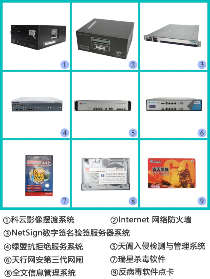 绿盟科技集团股份有限公司捐赠了抗拒绝服务系统、入侵防护系统、远程安全评估系统、运维安全管理系与WEB应用防护系统,其中抗拒绝服务系统基于机器学习建模、交互式动态防护算法、大数据威胁情报等技术,在IPv4、IPv6及两者混合网络环境中,能够全面精准防护各类DDoS攻击。安天科技集团股份有限公司捐赠的“安天防线”反病毒软件点卡是2000年后我国商业反病毒软件典型实物,反映了早期个人终端的安全防护模式;普世时代科技有限公司捐赠了科云影像摆渡系统、科云安全隔离与信息单向导入系统、科云光盘打印刻录一体、科云文印交互终端及科云光盘摆渡系统,其中科云影像摆渡系统突破了在物理隔离的两个网络中无法进行数据实时跨网传输的局限性,支持文件摆渡、数据库摆渡、应用协议代理转发,具有数据检查与过滤功能,实现不同等级网络之间的数据实时单向无反馈传输。启明星辰信息技术集团股份有限公司捐赠的天阗入侵检测与管理系统是一款智能化的入侵检测系统,对于病毒、蠕虫、木马、DDoS、扫描、SQL注入、XSS、缓冲区溢出、欺骗劫持等攻击行为以及网络资源滥用行为等威胁具有高精度的检测能力。瑞星网安技术股份有限公司捐赠的杀毒卡与不同版本杀毒软件,展现出了我国反病毒技术的迭代历程。拓尔思信息技术股份有限公司捐赠的上世纪九十年代“全文信息管理系统”、“新闻资料处理系统”及早期软件产品光盘为研究早期中文网络信息安全技术提供了珍贵的一手资料。拓尔思天行网安信息技术有限责任公司捐赠的从一代到三代的天行网安网闸,勾勒出了网络边界隔离技术的发展轨迹。天融信科技集团股份有限公司捐赠了1996年产Internet安全防火墙、网络卫士防火墙、网络卫士VPN及安全管理平台TSMTopAnalyzer,其中Internet安全防火墙,作为我国自主研发的早期商用防火墙产品,突破了国外技术垄断,是我国网络边界防护自主化进程的重要见证。信安世纪科技股份有限公司捐赠了NetSign数字签名验签服务器系统、NetPass动态密码系统、NetSafe安全互联网关系统以及USB-KEY智能密码钥匙,其中NetSign数字签名验签服务器系统能够对各类电子信息数据、电子文档等提供基于数字证书的数字签名服务,并对签名数据验证其签名真实性和有效性,满足用户在网络行为中不可否认、信息完整性、私密性等需求,并提供相关认证交易信息溯源验证。